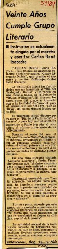 Ñuble: veinte años cumple Grupo Literario [artículo] / Mario Landa Reyes. El Mercurio (Santiago, Chile)-- sept. 25, 1983, p. C10. .