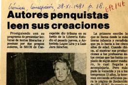 Autores penquistas leen sus creaciones [artículo] / Crónica (Diario : Concepción, Chile)-- nov. 28, 1981, p. 18. .