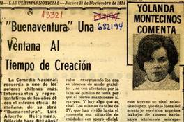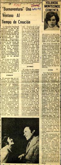 Buenaventura" una ventana al tiempo de creación [artículo] / Yolanda Montecinos. Las Últimas Noticias (Diario : Santiago, Chile)-- nov. 21, 1974, p. 12. retr. .