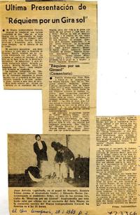 Ultima representación de "Réquiem por un girasol" [artículo] / Teatromaniaco. El Sur (Diario : Concepción, Chile)-- ene. 28, 1979, p. 2. fot. .