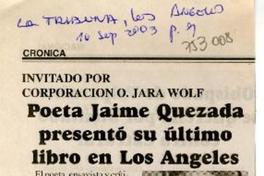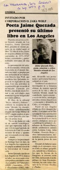 Poeta Jaime Quezada presentó su último libro en Los Angeles. [artículo] La Tribuna (Diario : Los Angeles, Chile)-- sept. 16, 2003, p. 9. retr. .