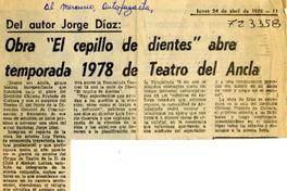 Obra "El cepillo de dientes" abre temporada 1978 de Teatro del Ancla. [artículo] El Mercurio (Antofagasta, Chile)-- abr. 24, 1978, p. 11. .