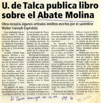 U. de Talca publica libro sobre el Abate Molina. [artículo] El Centro (Diario : Talca, Chile)-- dic. 26, 1999, p. B11. .