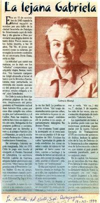 La lejana Gabriela. [artículo] La Estrella del Norte (Diario : Antofagasta, Chile)-- dic. 17, 1999 (suplemento) retr. .