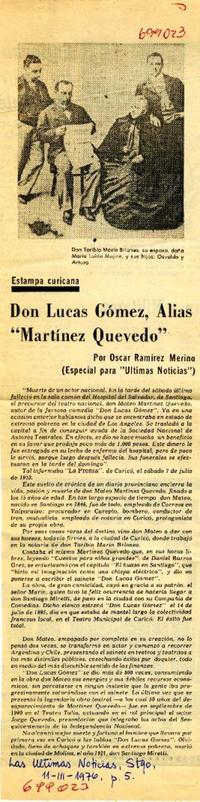 Don Lucas Gómez, alias "Martínez Quevedo" [artículo] / Oscar Ramírez Merino. Las Últimas Noticias (Diario : Santiago, Chile)-- mar. 11, 1976, p. 5. .