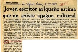 Joven escritor ariqueño estima que no existe apagón cultral [artículo] / La Defensa (Diario : Arica, Chile)-- mar. 11, 1980, p. 4. .