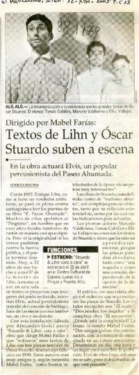 Textos de Lihn y Oscar Stuardo suben a escena [artículo] / Verónica Marinao. El Mercurio (Diario : Santiago, Chile)-- abr. 12, 2005, p. C15. 1 página : ilustración en blanco y negro. .