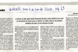 Historia y poder. [artículo] / Marcelo Javier Neira Navarro. La Nación (Diario : Santiago, Chile)-- jun. 5, 2008, p. 15. La Nación (Diario : Santiago, Chile)-- ago. 1, 2008, p. .