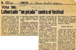 Lafourcade "en picada" contra el festival [artículo] / Abel Brevis. El Diario Austral (Diario : Valdivia, Chile)-- feb. 3, 1986, p. 24 El Diario Austral (Diario : Temuco, Chile)-- feb. 4, 1986, p. 5. 1 página .