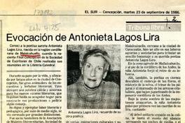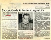 Evocación de Antonieta Lagos Lira [artículo] / Luis Jara Sánchez. El Sur (Diario : Concepción, Chile)-- sept. 23, 1986, p. 2. 1 página : ilustración en blanco y negro. .
