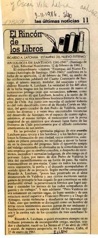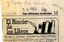 Ricardo A. Latcha: "Estampas del Nuevo Extremo" [artículo] / Filebo. Las Últimas Noticias (Diario : Santiago, Chile)-- noviembre 9, 1986, página 11. 1 página. .