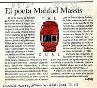 El poeta Mahfud Massis tal cual [artículo] / Lázaro. Diario siete (Santiago, Chile) abr. 4, 2006, p. 15. 1 página : ilustraciones en color ; 12 cm. .