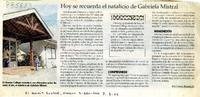 Hoy se recuerda el natalicio de Gabriela Mistral [artículo] / por Loreto Bustos N. Austral (Diario : Osorno, Chile) abr. 7, 2006, p. A.13. 1 página : ilustraciones en blanco y negro ; 13 cm. .