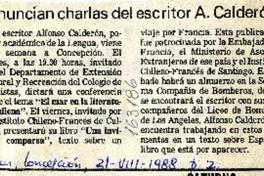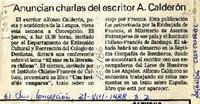 Anuncian charlas del escritor A. Calderón. [artículo] El Sur (Diario : Concepción, Chile)-- ago. 21, 1988, p. 2. .