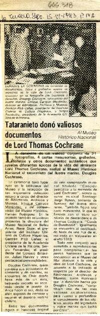 Tataranieto donó valiosos documentos de Lord Thomas Cochrane. [artículo] La Tercera (Diario : Santiago, Chile)-- jun. 15, 1983, p. 14A. 1 página : ilustración en blanco y negro. .