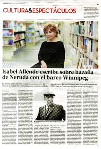 Isabel Allende escribe sobre hazaña de Neruda con el barco Winnipeg [artículo] Javier García.