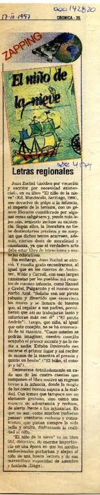 Letras regionales. [artículo] Crónica (Diario : Chillán, 1997)-- mar. 17, 1997, p. 25 .