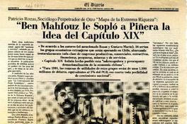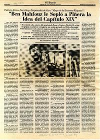 "Ben Mahfouz le sopló a Piñera la idea del Capítulo XIX" [artículo] / F. V. D. El Diario Financiero (Diario : Santiago, Chile)-- mar. 29, 1989, p. 16. 1 página : ilustración en blanco y negro. .