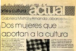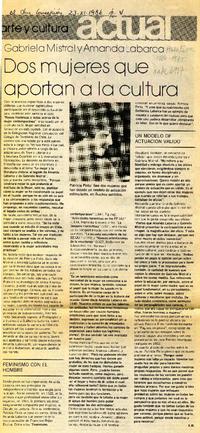 Dos mujeres que aportan a la cultura [entrevista] / [artículo] : A. M. El Sur (Diario : Concepción, Chile)-- nov. 23, 1986, p. V. .