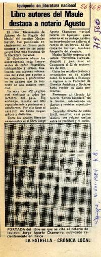Libro autores del maule destaca a notario Agusto [artículo] La Estrella (Diario : Iquique, Chile)-- ago. 4, 1984, p. . 1 página : ilustración en blanco y negro. .