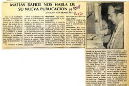 Matías Rafide nos habla de su nueva publicación [artículo] / Boris Van Dorsee Reyes. El Claro (Diario : Talca, Chile)-- jul. 25, 1984, p. 2. 1 página : ilustración en blanco y negro. .