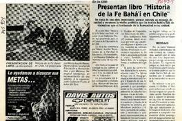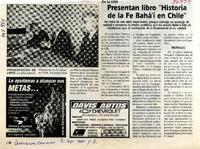 Presentan libro "Historia de la Fe Bahá'i en Chile". [artículo] La Discusión (Diario : Chillán, Chile)-- sept. 9, 2001, p. 8. .