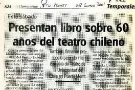 Presentan libro sobre 60 años del teatro chileno [artículo] / Marta Zúñiga Gatica. El Llanquihue (Diario : Puerto Montt, Chile)-- jun. 28, 2001, p. A26. .