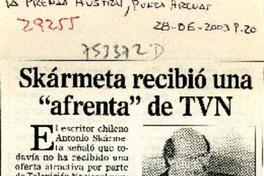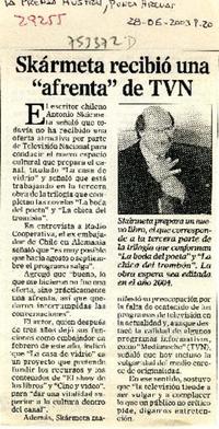 Skármeta recibió una "afrenta" de TVN [artículo] La Prensa Austral (Diario : Punta Arenas, Chile) jun. 28, 2003, p. 20. 1 página : ilustraciones en blanco y negro. .
