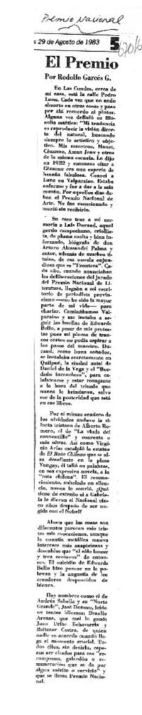 El Premio [artículo] / Por Rodolfo Garcés G. Las Últimas Noticias (Diario : Santiago, Chile)-- ago. 29, 1983, p. 5. 1 página. .