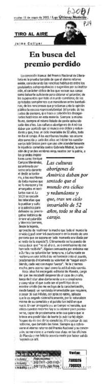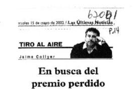 En busca del premio perdido [artículo] / Jaime Collyer. Las Últimas Noticias (Diario : Santiago, Chile)-- mayo 15, 2002, p. 14. .