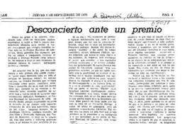 Desconcierto ante un premio [artículo] / Miguel Angel Díaz A. La Discusión (Diario : Chillán, Chile)-- sept. 7, 1978, p. 3. 1 página. .