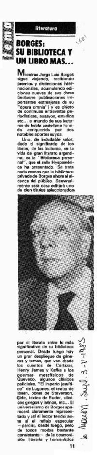 Borges: su biblioteca y un libro mas-- [artículo]. La Nación (Diario: Santiago, Chile) mayo. 3, 1985, p. 11 .