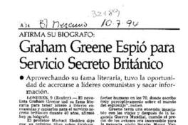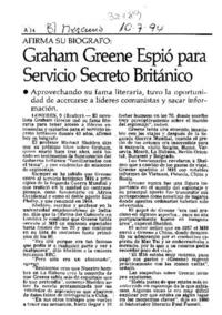 Graham Greene espió para servicio secreto británico. [artículo] El Mercurio (Diario : Santiago, Chile)-- jul. 10, 1994, página A14. 1 página. .
