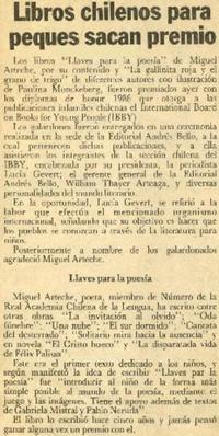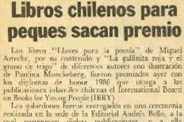 Libros chilenos para peques sacan premio [artículo]. La Cuarta (Diario : Santiago, Chile)-- ene. 29, 1987, p. 4. 1 página , 15 cm. .