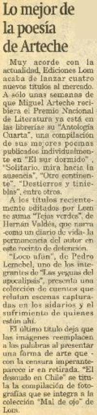 Lo mejor de la poesía de Arteche [artículo]. La Tercera (Diario : Santiago, Chile)-- oct. 2, 1996, p. 43 1 página ; 18 cm. .