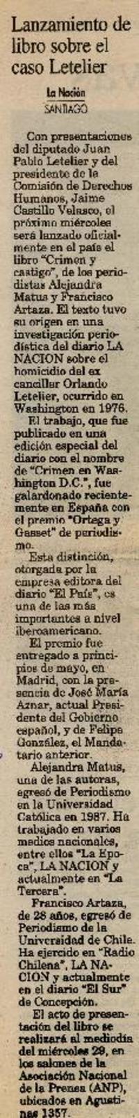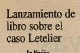 Lanzamiento de libro sobre el caso Letelier [artículo]. La Nación (Diario : Santiago, Chile)-- mayo 24, 1996, p. 12. 1 página ; 32 cm. .
