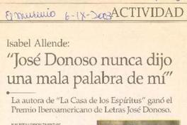 "José Donoso nunca dijo una mala palabra de mí" [entrevista] / [artículo] : Maureen Lennon Zaninovic. El Mercurio (Diario : Santiago, Chile)-- sept. 6, 2003, p. C20. 1 página : ilustración en color ; 31 cm. .