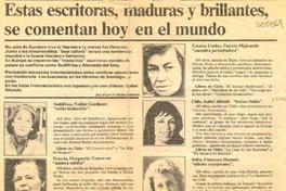 Estas escritoras, maduras y brillantes se comentan hoy en el mundo [artículo] / Por, Patricio Rojas Barrera. La Segunda (Diario : Santiago, Chile)-- feb. 13, 1987, p. 16. 1 página : ilustraciones en blanco y negro ; 23 cm. .