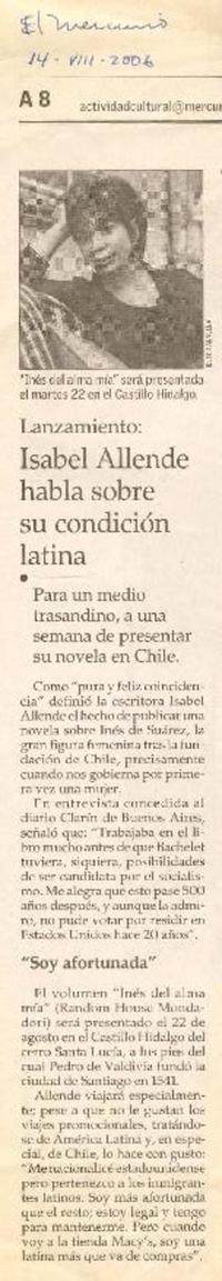 Isabel Allende habla sobre su condición latina [artículo]. El Mercurio (Diario : Santiago, Chile)-- ago. 14, 2006, p. A8 1 página : ilustración en blanco y negro ; 31 cm. .