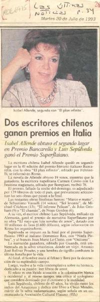 Dos escritores chilenos ganan premios en Italia [artículo] / EFE. Las Últimas Noticias (Diario : Santiago, Chile)-- Julio 20, 1993, página 34. 1 página : ilustración en color ; 26 cm. .