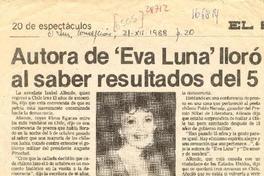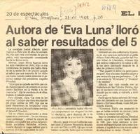 Autora de "Eva luna" lloró al saber resultados del 5 [artículo]. El Sur (Diario : Concepción, Chile)-- Diciembre 21, 1988, página 20. 1 página : Ilustración en blanco y negro ; 17 cm. .