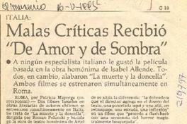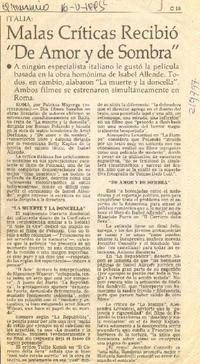Malas críticas recibió "De amor y de sombra" [artículo]. El Mercurio (Diario : Santiago, Chile)-- mayo 16, 1995, p. C19. 1 página ; 25 cm. .