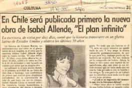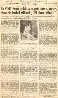 En Chile será publicada primero la obra de Isabel Allende "El plan infinito" [entrevista] / [artículo] : María Angélica Rivera. Las Últimas Noticias (Diario : Santiago, Chile)-- Noviembre 19, 1991, página 31. 1 página : ilustración en blanco y negro. 29 cm. .