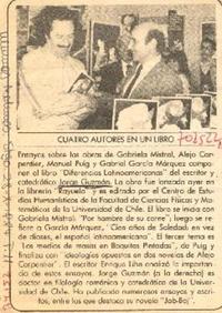 Cuatro autores en un libro [artículo]. Las Últimas Noticias (Diario : Santiago, Chile)-- oct. 28, 1984, p. 11. 1 página : ilustración en blanco y negro ; 12 cm. .