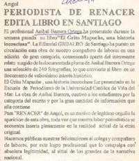 Periodista de Renacer edita libro en Santiago [artículo]. Renacer de Chile (Diario : Angol, Chile)-- Septiembre 5, 1999, página 3. 1 página : 12 cm. .