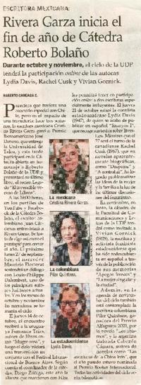 Rivera Garza inicia el fin de Cátedra Roberto Bolaño [artículo] / Roberto Careaga C. El Mercurio (Diario : Santiago, Chile)-- Septiembre 22, 2021, página A9. 1 página : ilustraciones en color ; 26 cm. .