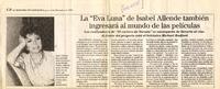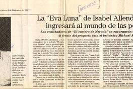 La "Eva Luna" de Isabel Allende también ingresará al mundo de las películas [artículo]. El Mercurio de Valparaíso (Diario : Chile)-- Diciembre 4, 1997, página C8. 1 página : ilustración en blanco y negro ; 15 cm. .