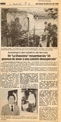 En "La Chascona" recuerdan los "20 poemas de amor y una canción desesperada" [artículo]. La Cuarta (Diario : Santiago, Chile)-- Julio 13, 1986, página 6. 1 página : ilustraciones en blanco y negro ; 27 cm. .
