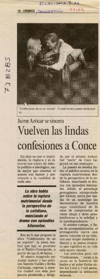Vuelven las lindas confesiones a Conce. [artículo] Crónica (Diario : Concepción, Chile)-- dic. 11, 2003, p. 16. 1 página : ilustración en blanco y negro ; 29 cm. .
