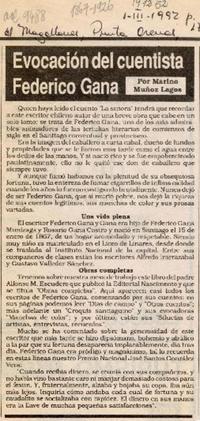 Evocación del cuentista Federico Gana [artículo] / Marino Muñoz Lagos. El Magallanes (Diario : Punta Arenas, Chile)-- mar. 1, 1992, página 17. 1 página : 19 cm. .